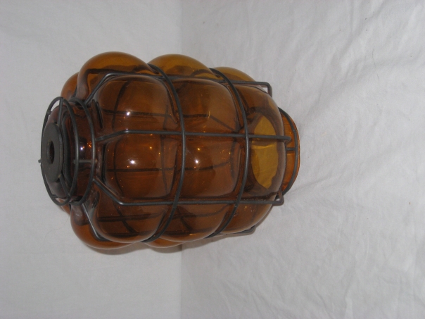 An odd looking glass container that has inlaid metal bars tracing around the entire container, which is setting off the caramel color of the glass.