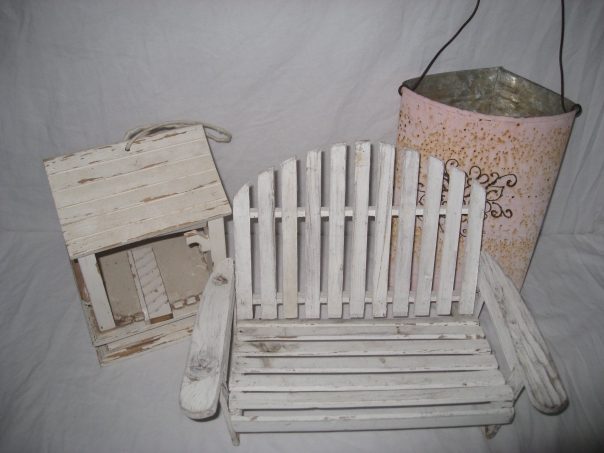 Small display of odd assortment of items including a bench and a basket.