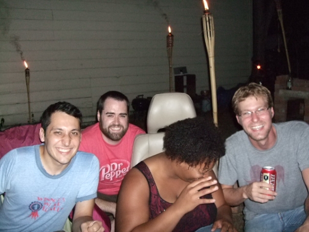 Four smiling friends laugh and relax outside around glowing, bamboo tiki torches.