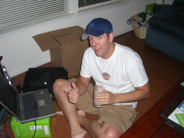 A barefoot man in brown shorts, white T-shirt, and navy blue baseball cap sits on a floor in front of a window with blinds, with a laptop open and balanced on a box. Another box is visible behind him as well as a chair, table, and basket.