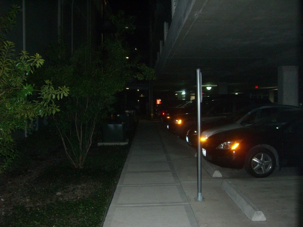 There are several care parked in the lower level of a parking ramp, each seeming to have its parking lights on. The lights all seem to be glowing or reflecting a very pumpkin-y orange light. The concrete the cars are on is white-ish rather than black-tar, as most driving and parking surfaces are. All of the cars seem to be dark colored. The parking spot closest to the viewer, which may be marked handicapped, is empty. There seems to be an electrical box across from the cars, like for a generator, or an A/C unit? |