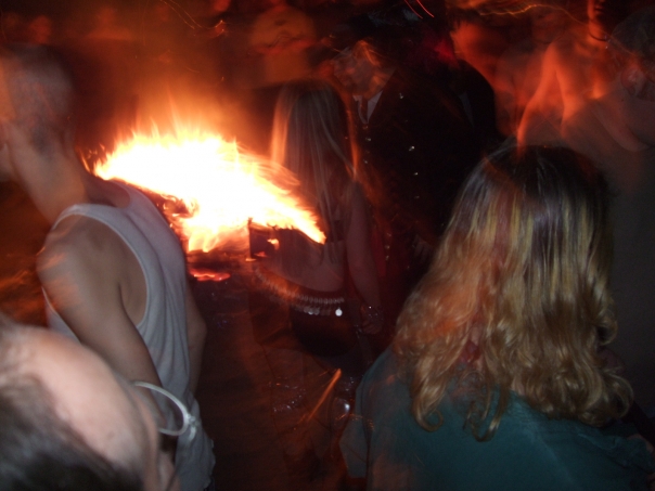 A group of young college students stand around a fire as they sing and dance.