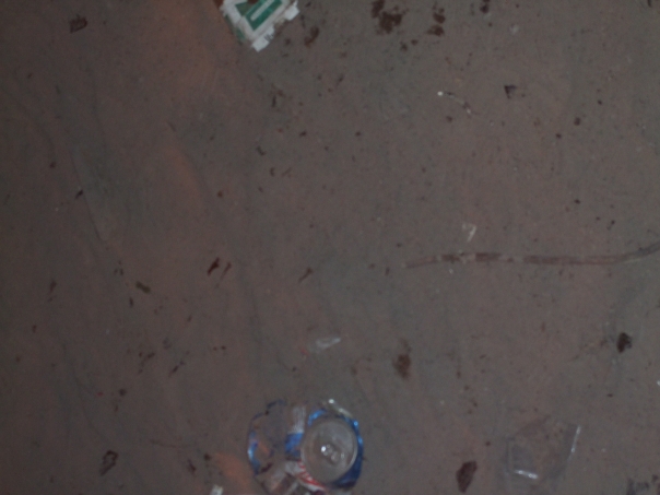 A squashed soda can and cigarette butts and pack are buried in the sand.