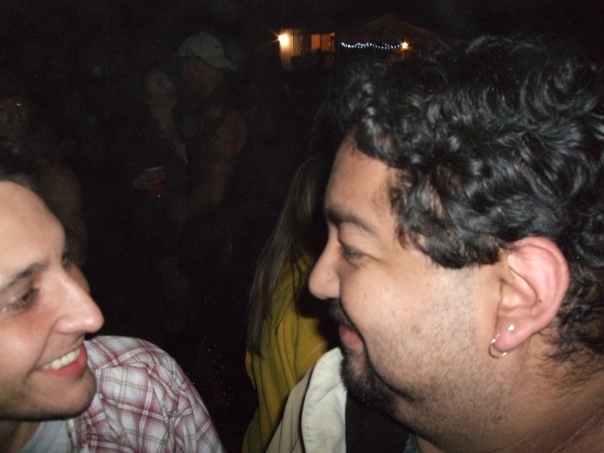 Two audlt were facing each other and smile , one fellow wear ear ring.