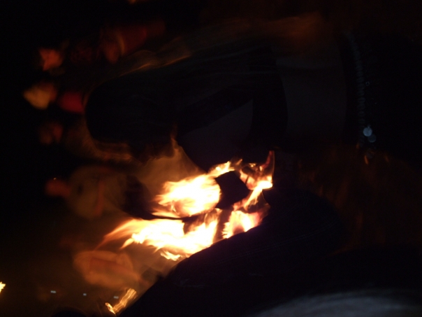 A young blond woman dressed in jeans and a skimpy top stands by a bonfire.