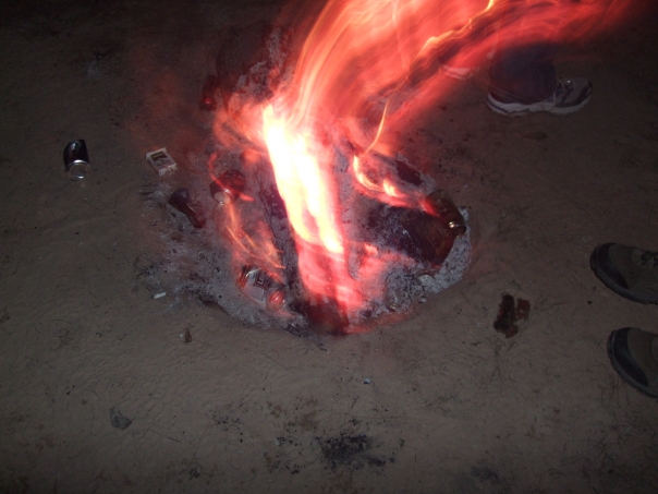 A blurry photo of a fire on the beach, with two sets of feet nearby.