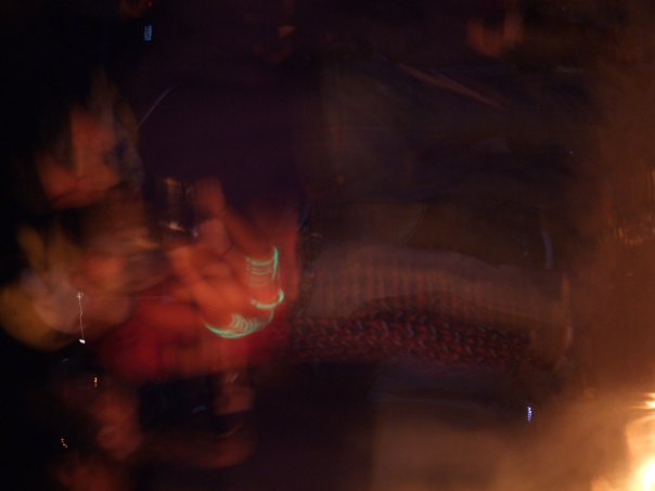 This is a very blurry picture of people dancing, maybe? It looks like the three main subjects of the photo are two men and a woman, but it's really difficult to make much out.