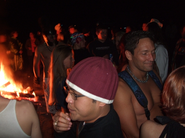 Night gathering group of people at a bon fire with main focus on asian man with glasses and red beanie.