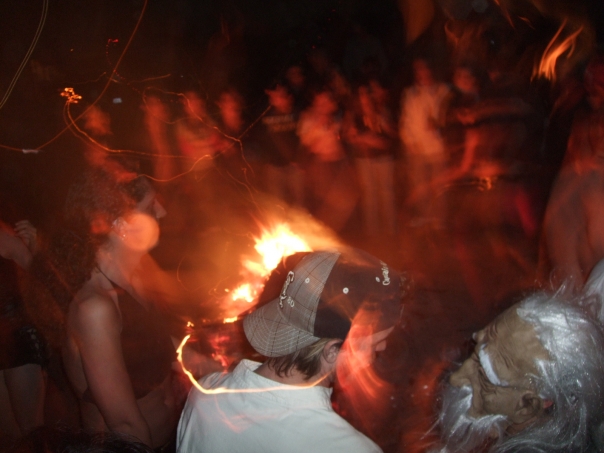 THE HUGE HOT BONFIRE POPS BRIGHTLY PROVIDING A NICE AMBIANCE FOR THE PARTY.