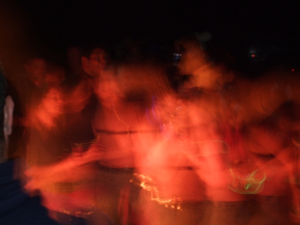 This is a red, blurry photo of a group of people who are gathered