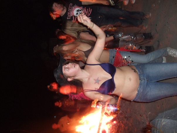 People are enjoying the campfire where a woman is standing with the bottle in her hand
