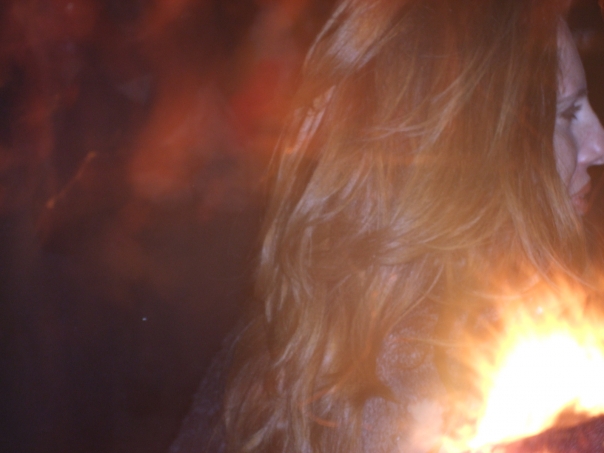 A very dark photo that has a glare spot on it of the side of a woman's face and head.