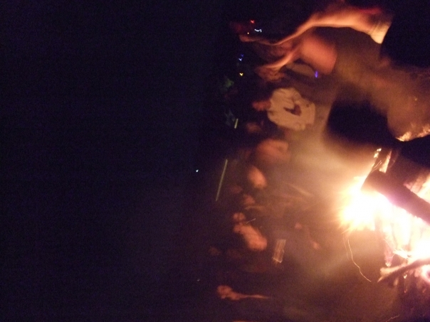 A large group of people dancing around a bomb fire at night.