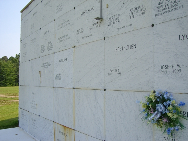 Crypts at cemetary one with blue flowers.