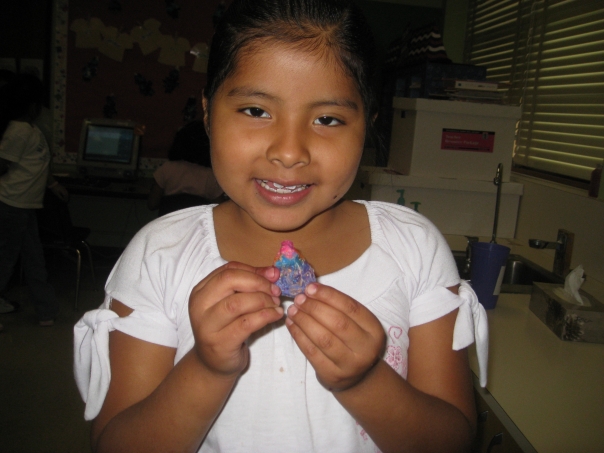 A young girl in a white shirt holds up a small purple and pink toy in her classroom.