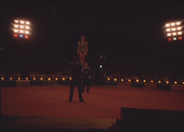 Two men and one woman colorful dressed getting ready to perform at a circus.