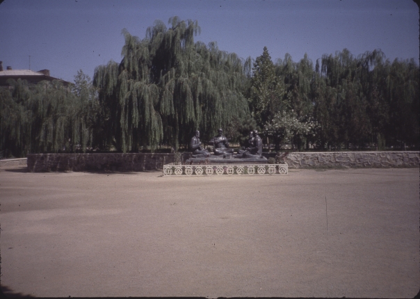 Several willow trees are behind a small stone wall and a sculpture of three people.