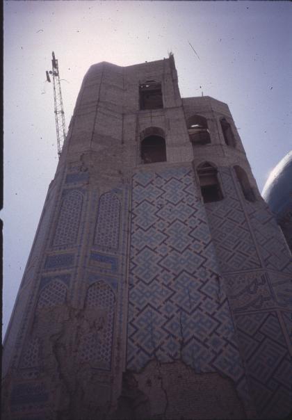 old and tall muslim building with some damage on the side beign repaired