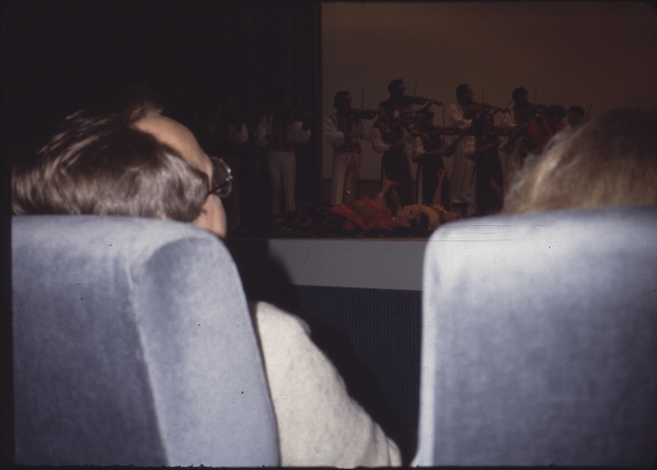 A bespectacled man sitting in a blue-gray chair in a darkened theater watching on stage violinists who appear to be part of a mariachi group.