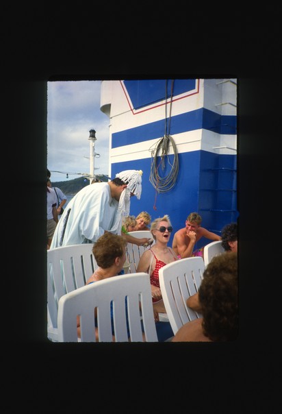 The men and women are sitting in white chairs on the boats deck.