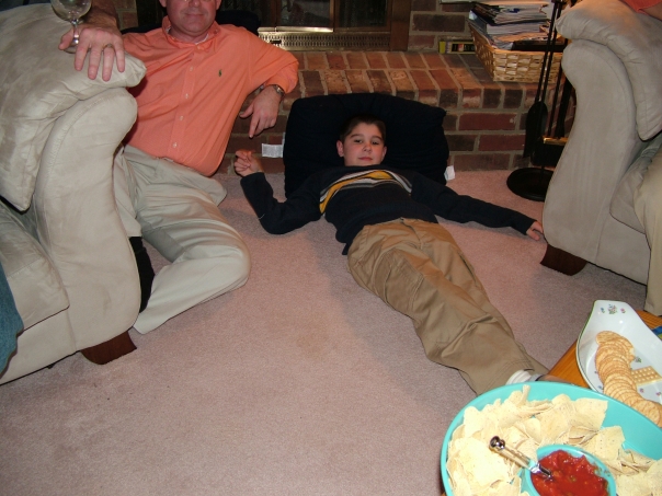 The man is on the floor and the boy is lying on the floor too
