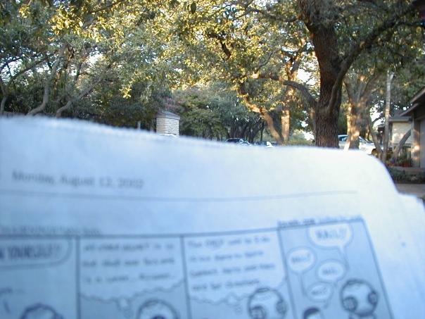 ![]() Monday August 12th, 2002 Austin, TX There really isn't anything I can say about this particular album. Nothing exciting happened on this day to my knowledge. I just had the camera handy, and evidently a Daily Texan (the University of Texas student paper) in my hand, and fired off a few shots. |