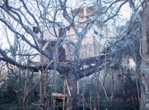 There was an elaborate tree house in the back yard good for playing in. |