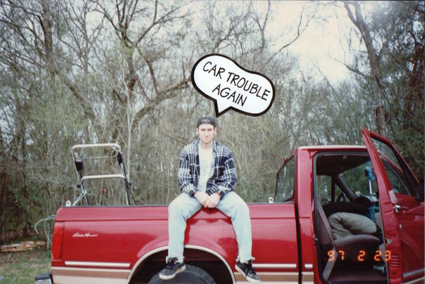 A man is seated on a red truck with an animated bubble that says car trouble again. |