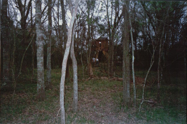 A tree house is only partially visible beyond many trees in a wooded area. |