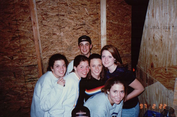 The six people are kneeling down in the unfinished room getting their photo taken. |