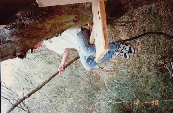 A man is sitting on a bench that is attached to a tree and holding a large, long stick. |