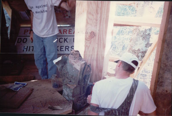 Two men wearing white shirts are in a wooded fort. One of the men is sawing a tree. |