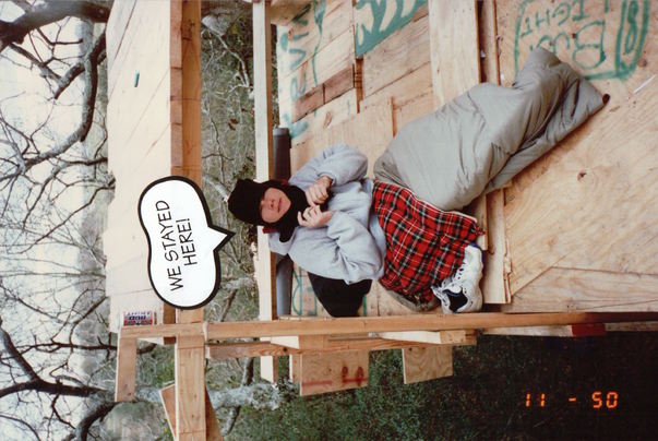 There is an image of a man lying down in a sleeping bag who is smiling |