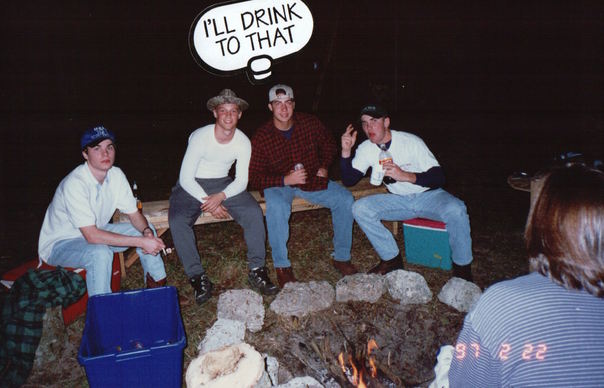 Four young adult males wearing jeans are sitting around a bonfire at night in a photo that is dated 1997. |