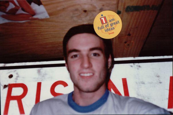 Shown here is a very arrogant young man with dark hair standing in front of a sign and a semi-pornographic photo. |