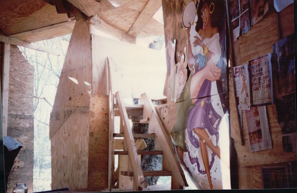 A clumpsy area with a small ladder, cutout, posters, a vessel etc. |