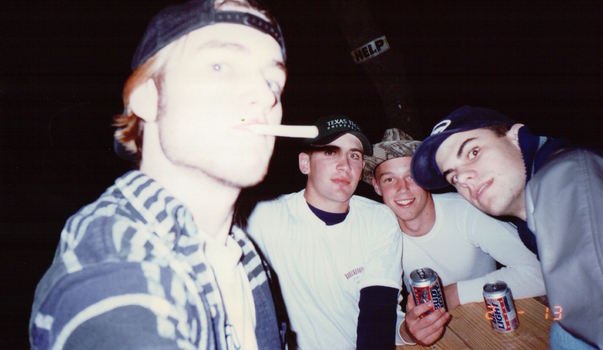 Four guys in their mid 20's are gathered around table in a dark room drinking beer. |