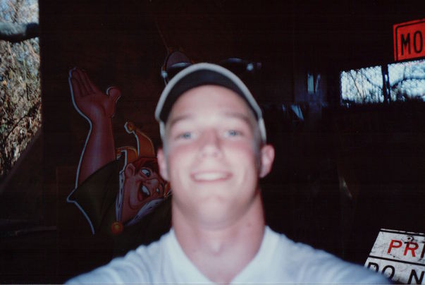 A man wearing a white t-shirt and baseball cap taking a selfie. |