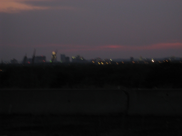 a blurry picture of a skyline at sundown with deep red and purples colors lighting the horizon.