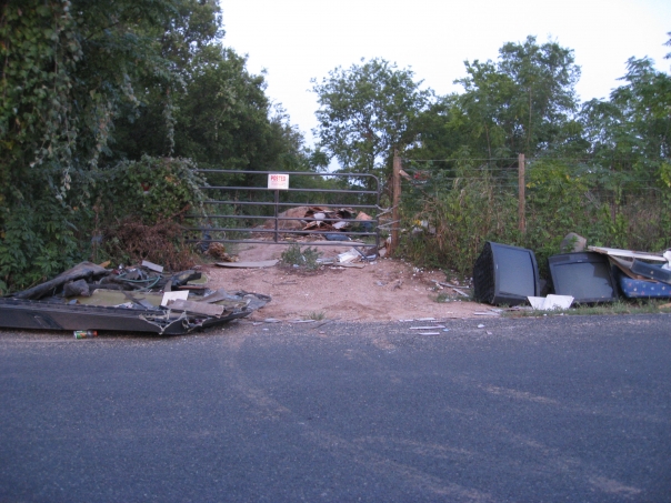 There are many pieces of garbage on the side of the road including three televisions