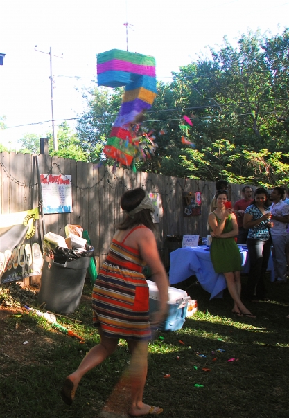 During the party the blindfolded girl in a dress swung a bat at the colorful pinata shaped like a numeral seven swinging above her head.