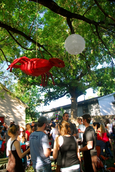 A group of college-aged party-goers socialize underneath a round white lantern and scorpion pinata, both hanging from the tree branches above them.