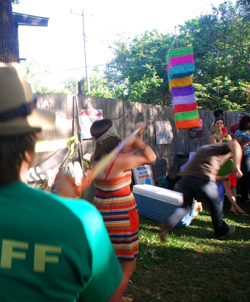 There's a woman blindfolded wearing a striped dress trying to hit a pinata