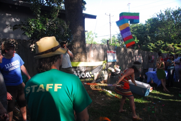 The party crowd gathers to watch a spirited woman bash a pinata.