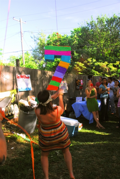 Brunette woman hits rainbow pinata in the shape of a "7" as amused friends look on.