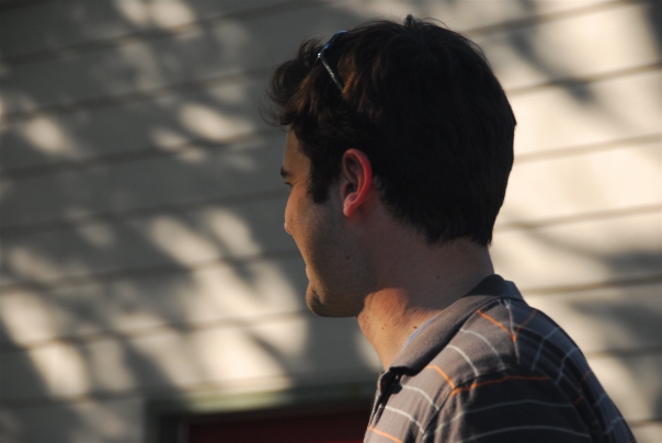A man smiles and looks to the side as he stands in dark shadows by a house.
