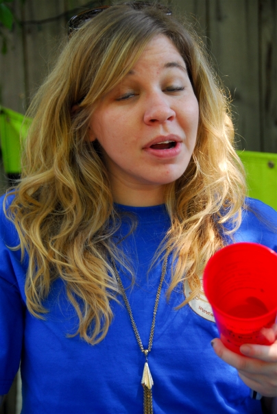 this woman in the blue shirt with the long hair is holding a red cup