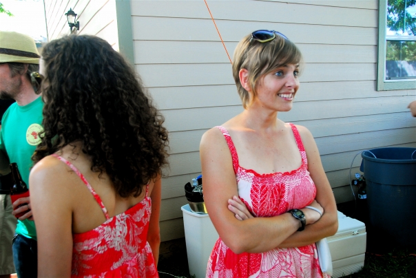 Picture of a scene from a backyard party with a woman looking intrigued in the middle of a conversation