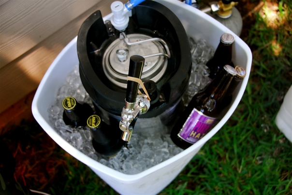 A bucket of beer with a keg as well in ice