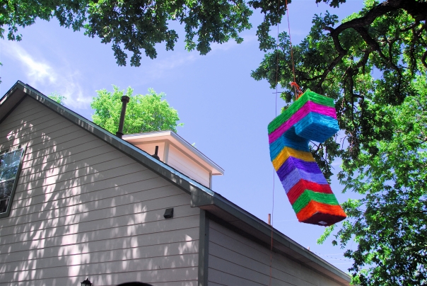 The pinata is up in a tree with a blue sky behind it.